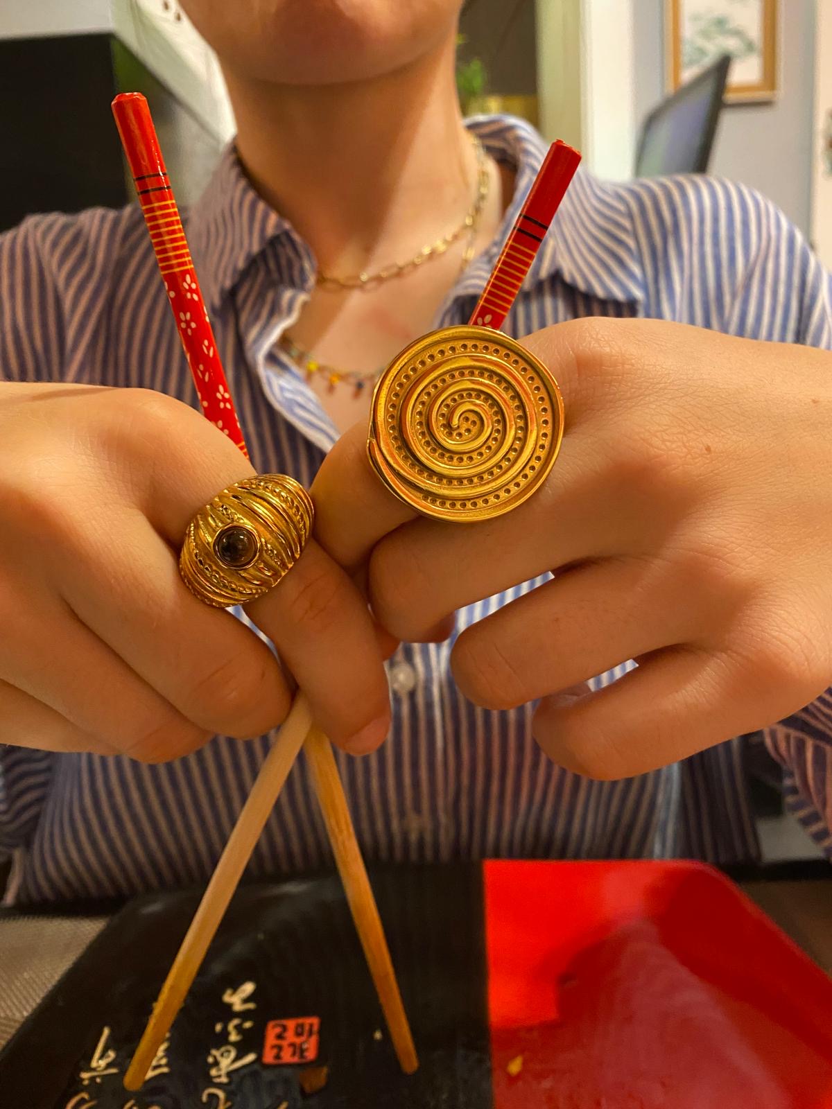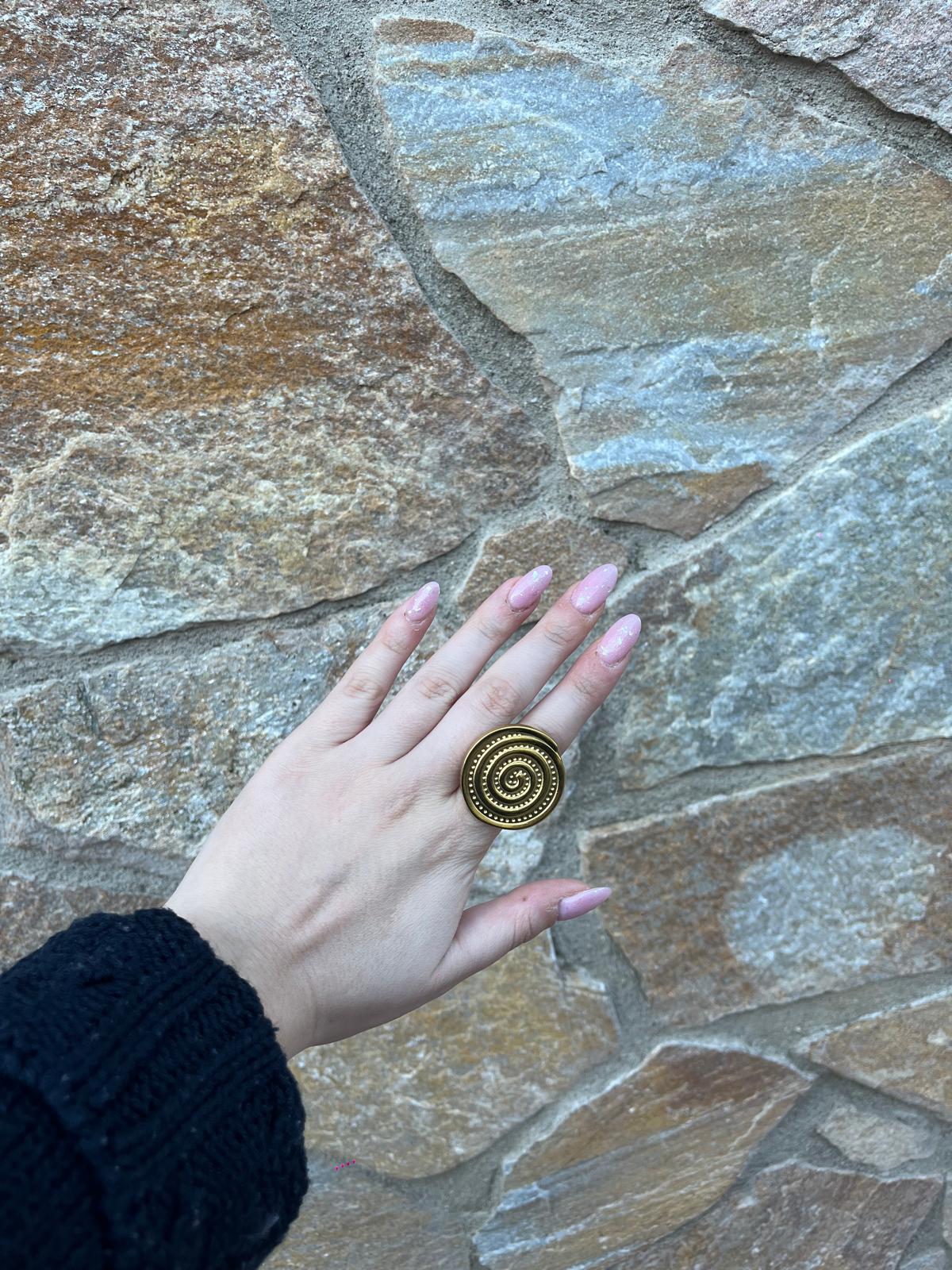 Descripción: Anillo dorado redondo, con forma de espiral.