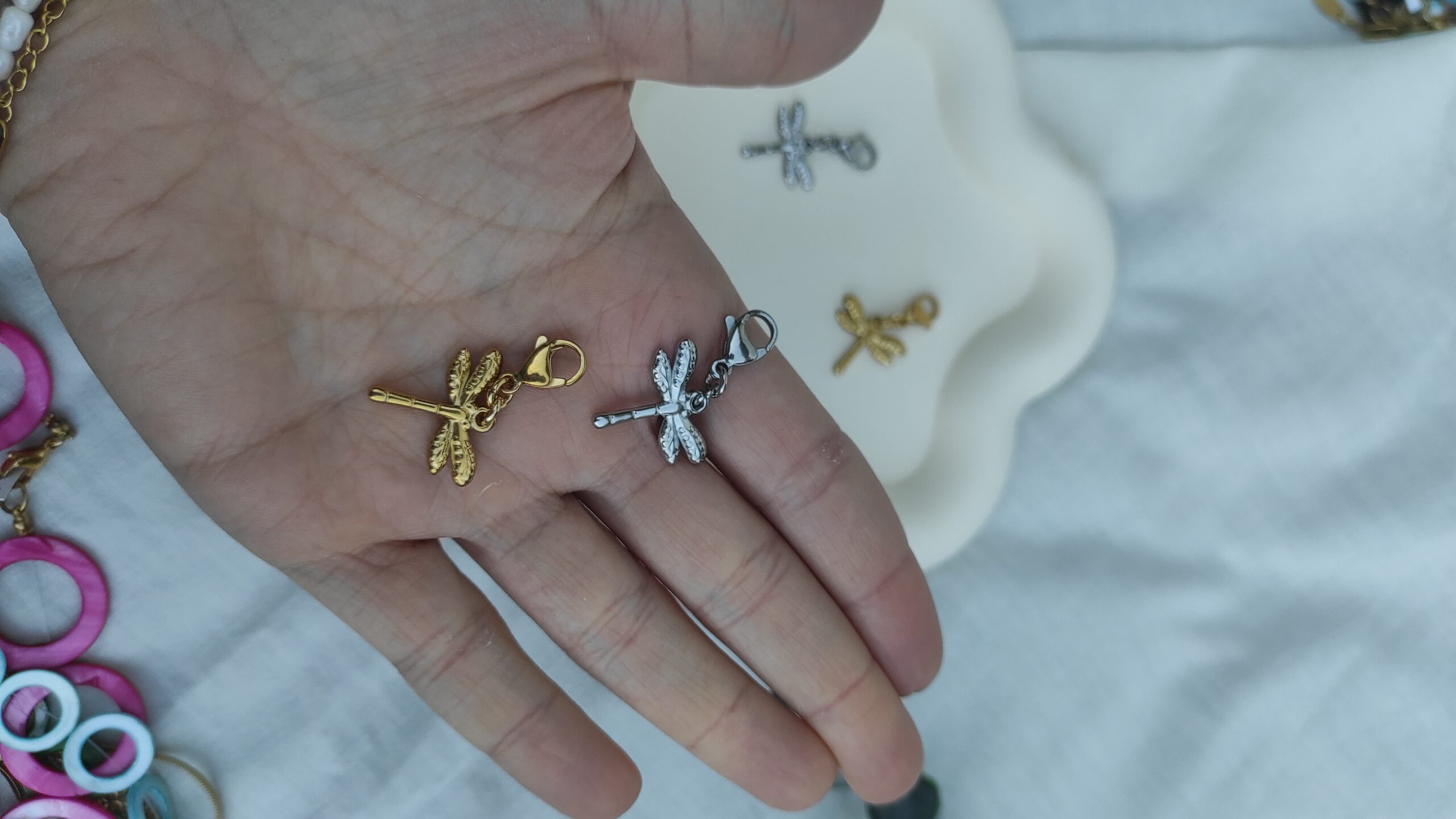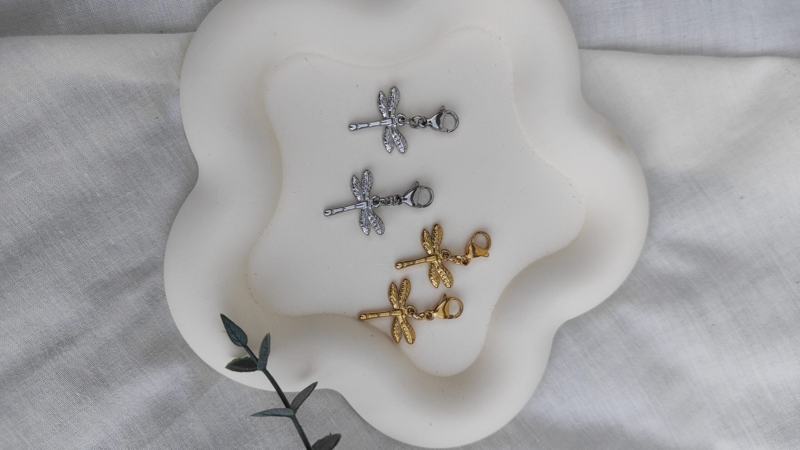 Descripción: Charm con forma de libélula en dorado o plateado.