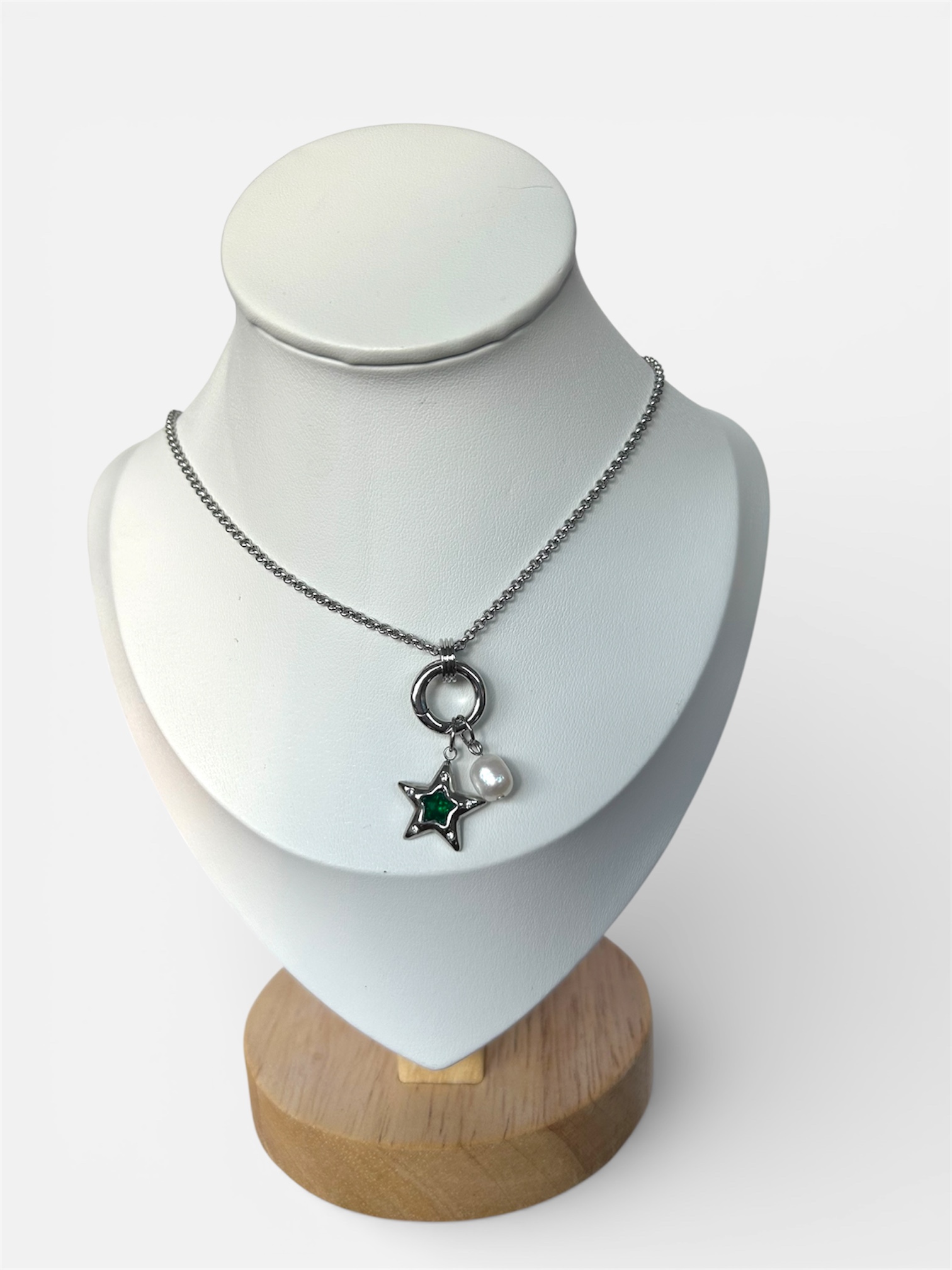 Descripción: Cadena con un charms de estrella verde y una perla natural.