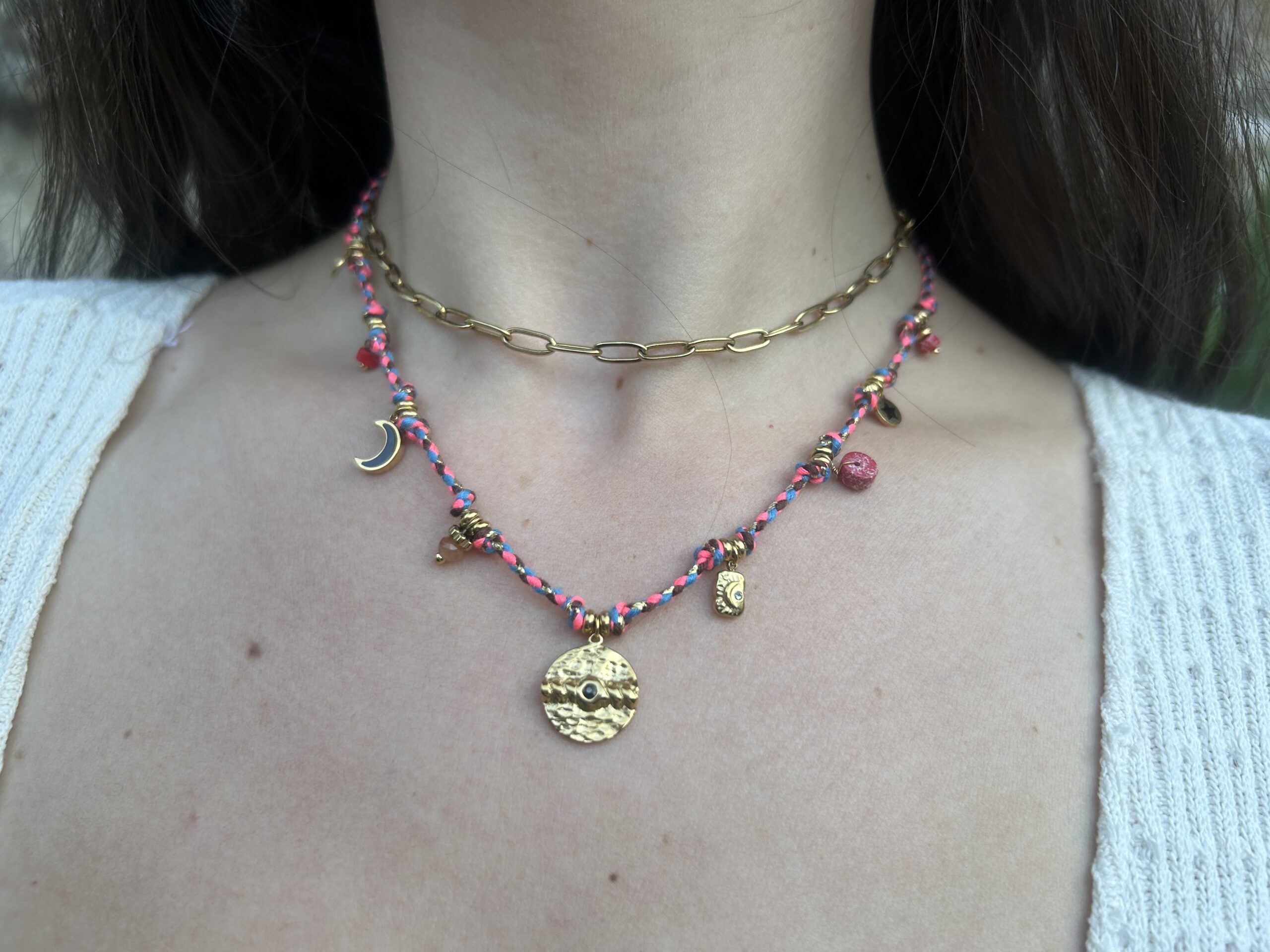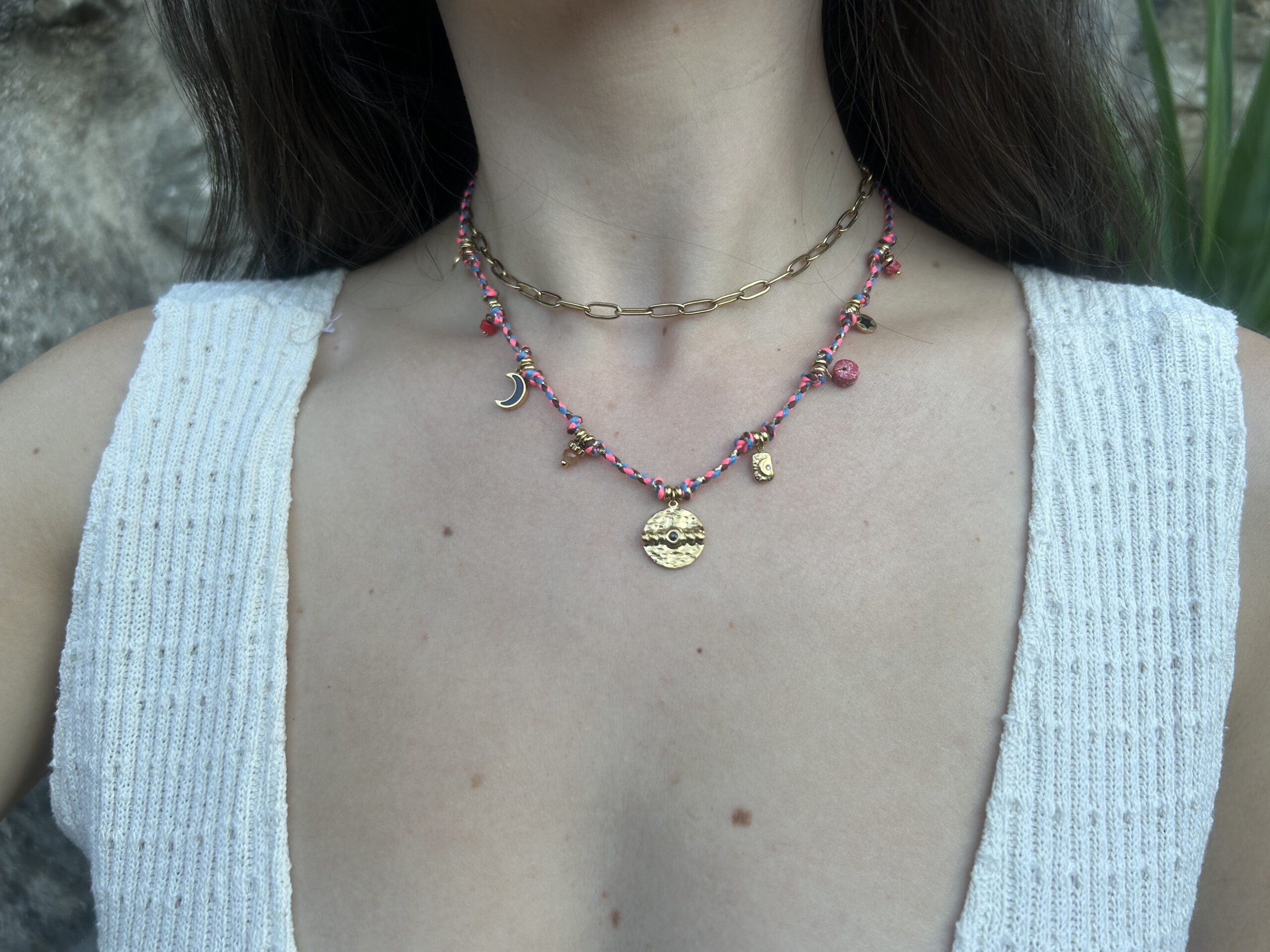 Descripción: Collar de hilo de colores combinado con colgantes de acero inoxidable.