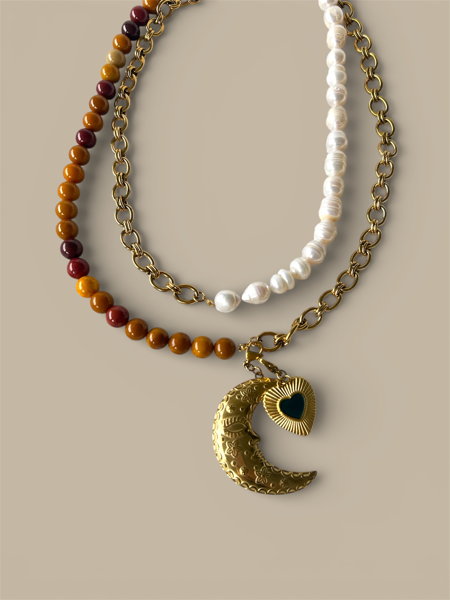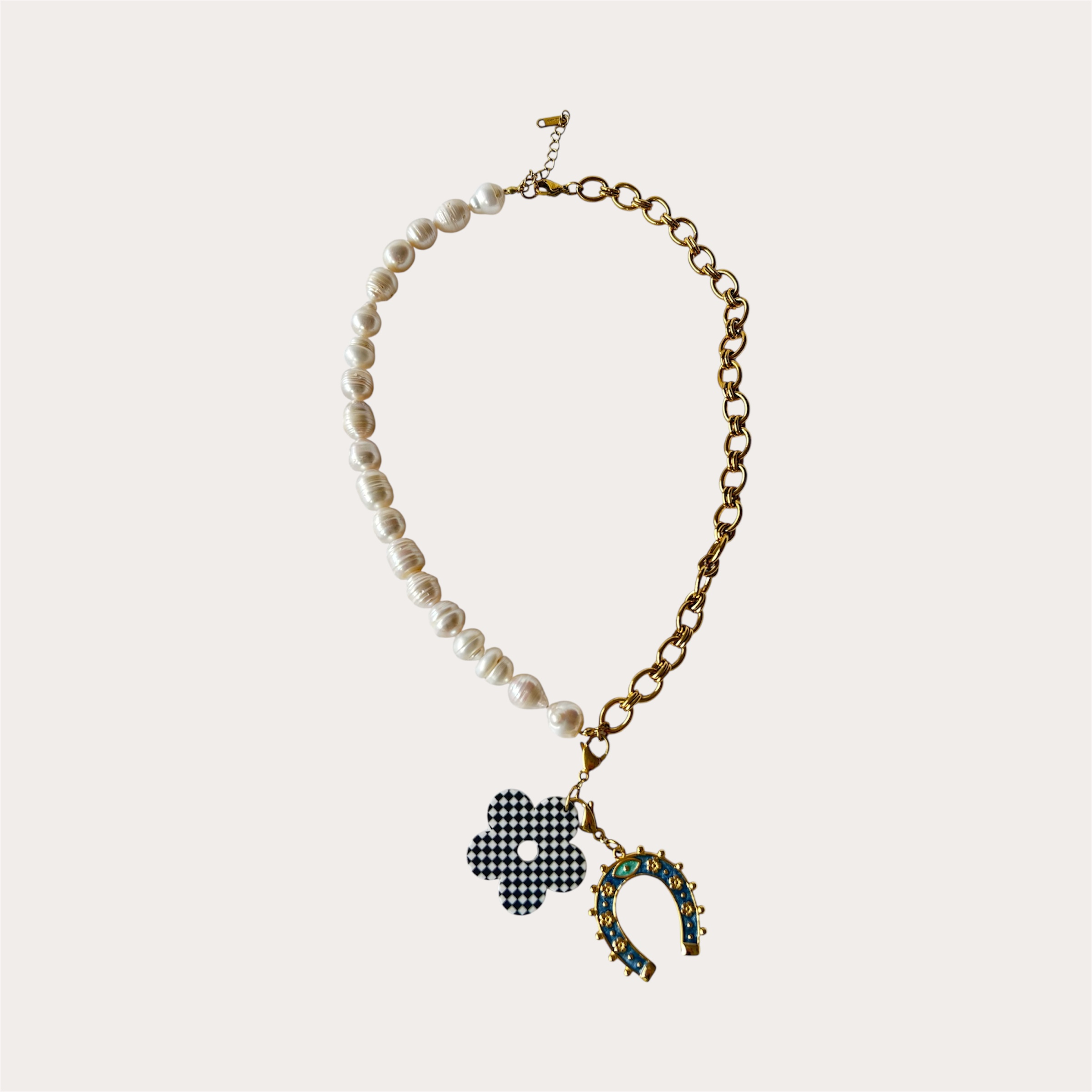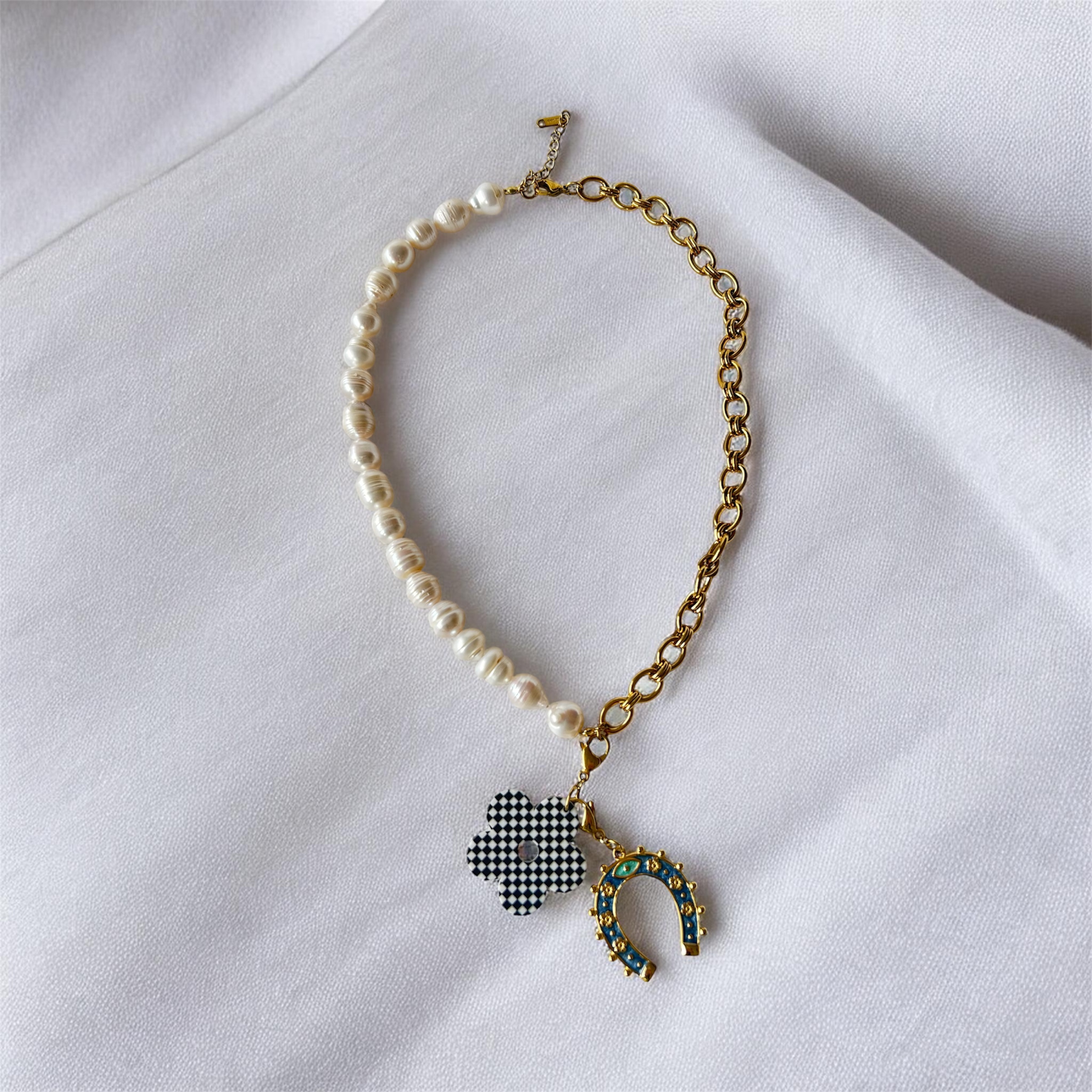 Descripción: Collar de perlas combinado con cadena de acero inoxidable.