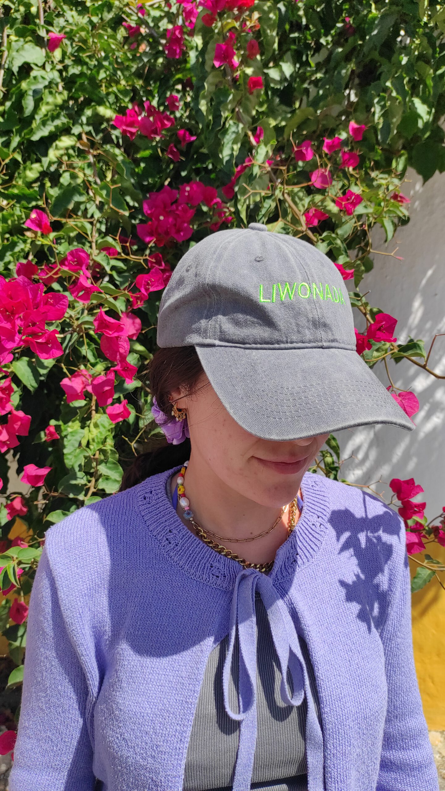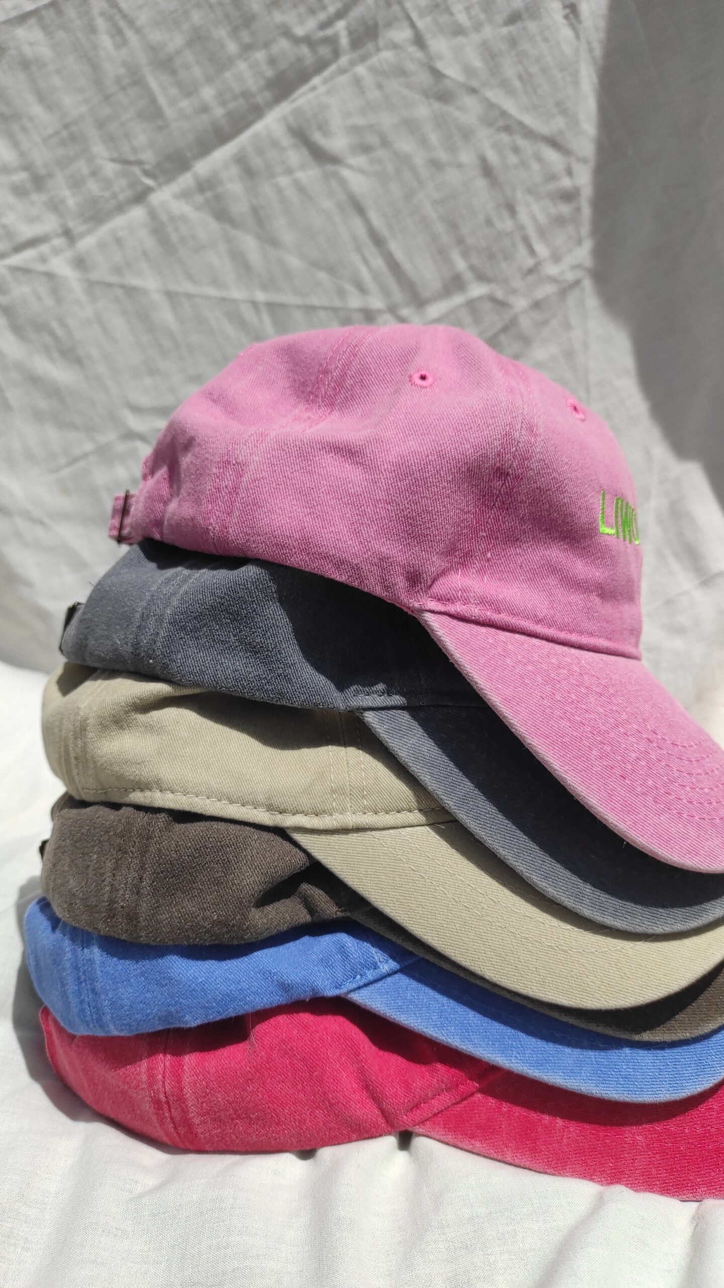 Gorras de diferentes colores con texto LIWONADA.Perfectas para combinar con cualquier estilo.